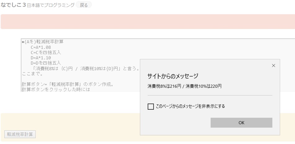 なでしこ3で作られたアプリ名『軽減税率計算(消費税計算)』です。(バージョン:3.0.61)